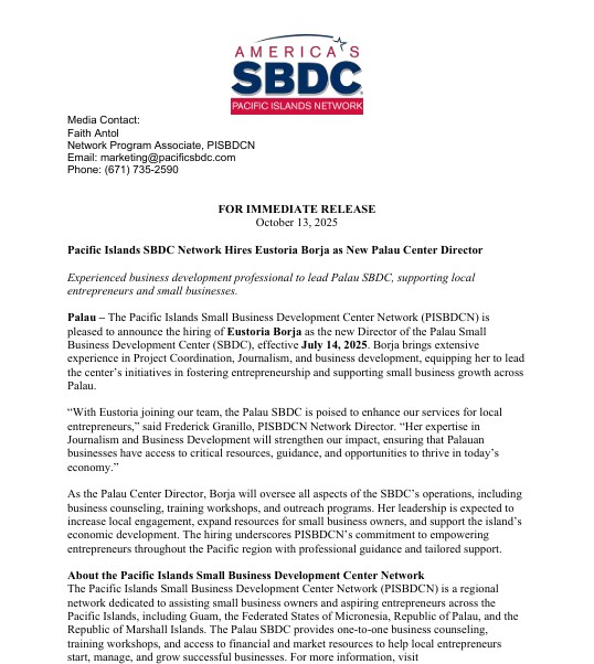 Pacific Islands SBDC Network Hires Eustoria Borja as New Palau Center Director
